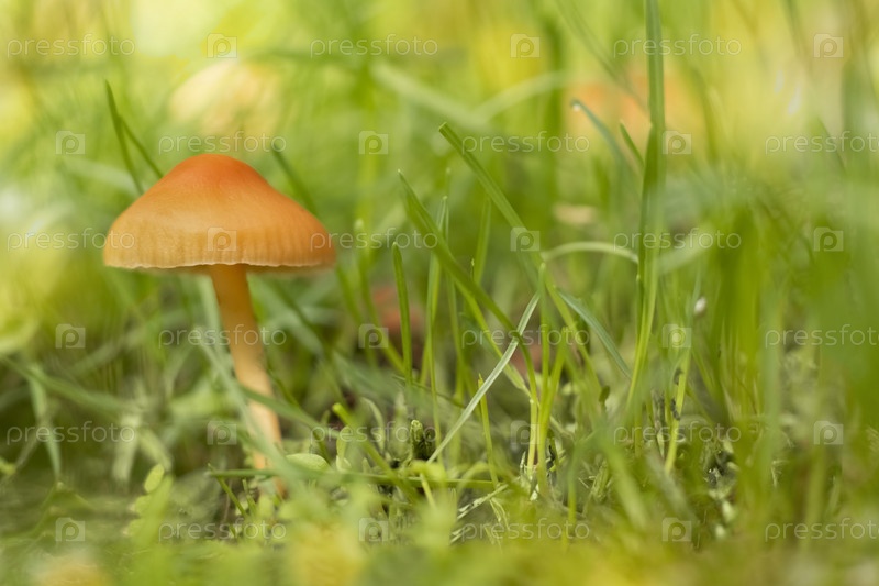 Маленький оранжевый гриб среди зеленой травы