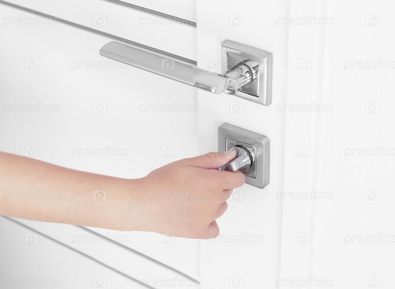 Ребенок поворачивает замок внутренней белой двери со стальной ручкой