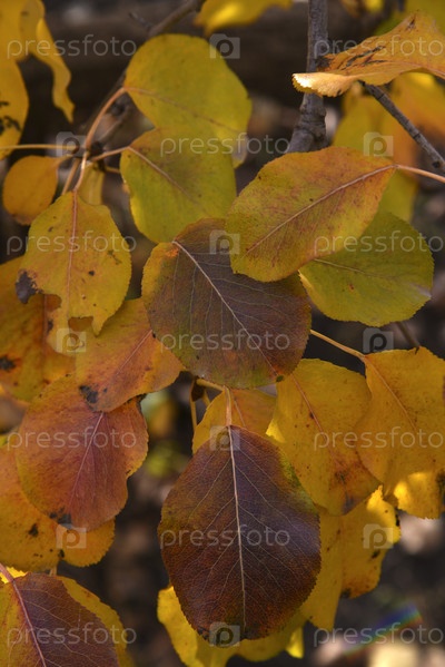 Красочные красно-желто-синие яблочные листья в осеннем саду. Красивые осенние цветы