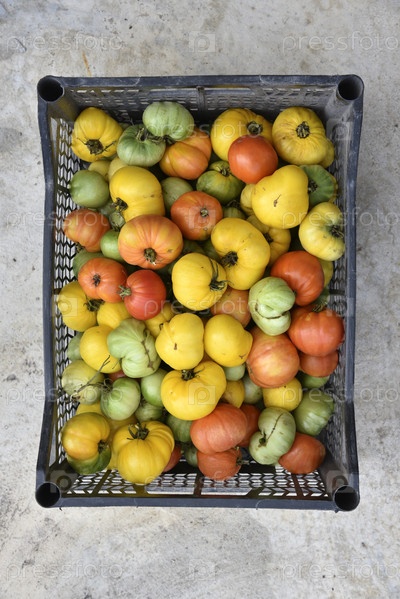 Красные желтые и зеленые помидоры в пластиковой коробке на улице. Сбор помидоров в пластиковую корзину