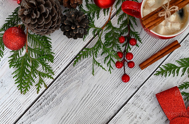 Рождественская открытка с игрушками, еловыми ветками и гирляндой. Декор сладостями, корицей