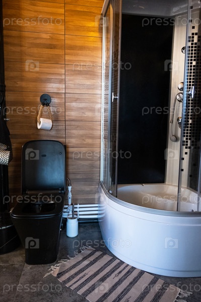 Туалет и душ в стиле лофт, темный интерьер, сочетание черного и дерева. Черный унитаз, уютный вязаный коврик
