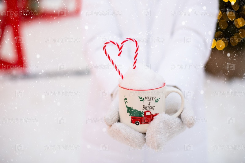 Женщина с кружкой снега, карамельной палочкой и надписью Merry and Bright в руках на улице в тёплых одеждах на зимнем праздничном рынке.Снежный городок к Новому году украсили гирляндами волшебных огней.Рождество