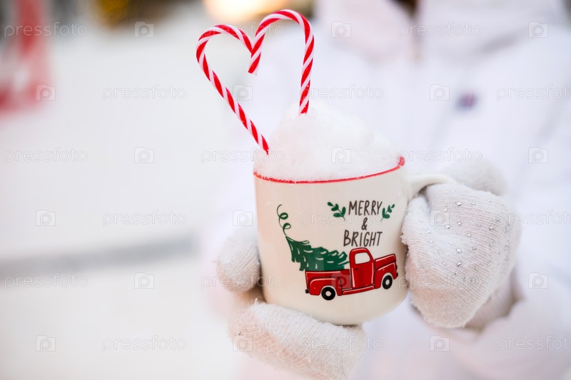 Женщина с кружкой снега, карамельной палочкой и надписью Merry and Bright в руках на улице в тёплых одеждах на зимнем праздничном рынке.Снежный городок к Новому году украсили гирляндами волшебных огней.Рождество