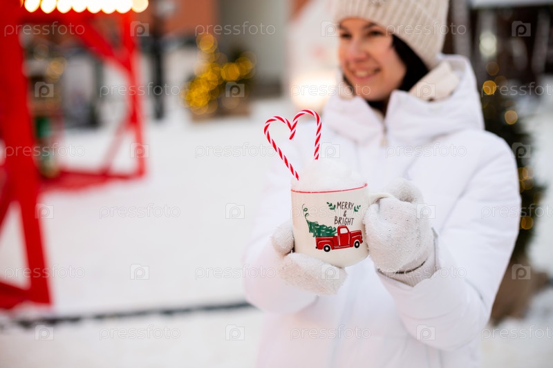 Женщина с кружкой снега, карамельной палочкой и надписью Merry and Bright в руках на улице в тёплых одеждах на зимнем праздничном рынке.Снежный городок к Новому году украсили гирляндами волшебных огней.Рождество