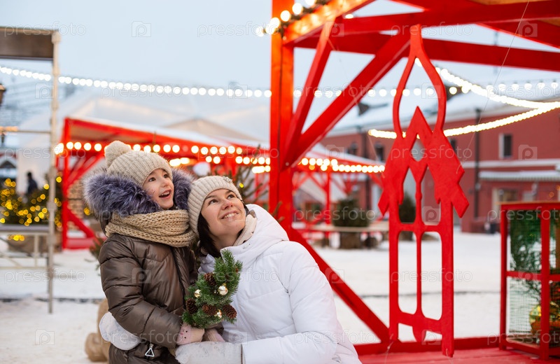 Мама и дочь на Рождество на открытом воздухе в теплой одежде зимой на праздничном рынке. Сказочные гирлянды украсили снежный городок к Новому году