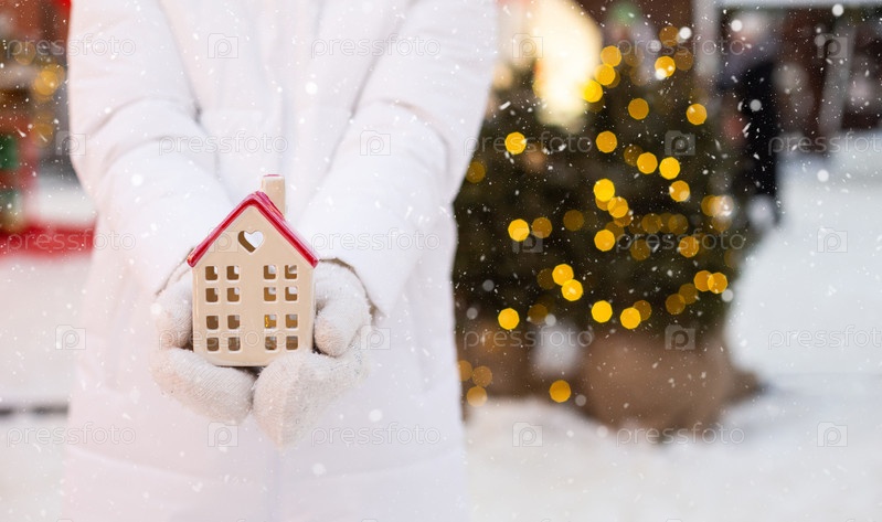 Дом, миниатюрный коттедж в руках женщины в варежках и теплой одежде на улице в снегу. Сделки с недвижимостью, покупка, строительство, переезд, ипотека. Уютный дом, Рождество, бронирование нового года