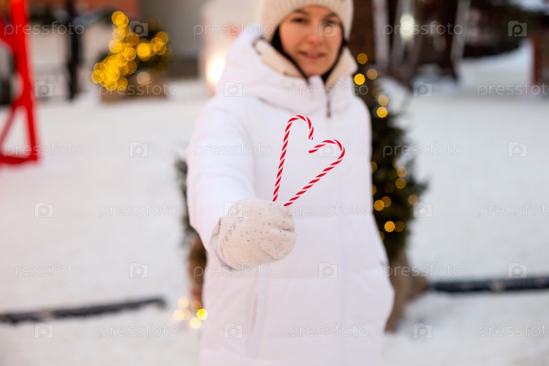 Женщина держит в руках леденец в форме сердца на открытом воздухе в белой теплой одежде на зимнем праздничном рынке. Снежный городок к Новому году украсили гирлянды волшебных огней. Новогоднее настроение