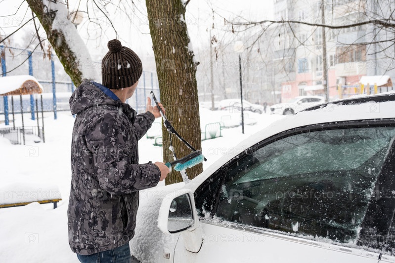 Мужчина стряхивает снег с машины после снегопада. Безопасность дорожного движения, сложные погодные условия зимой