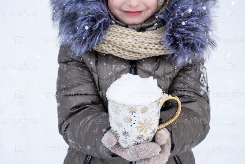 Девушка в теплой зимней верхней одежде держит в руках кружку со снегом - холодные погодные условия, сезонность. Рождество и Новый год