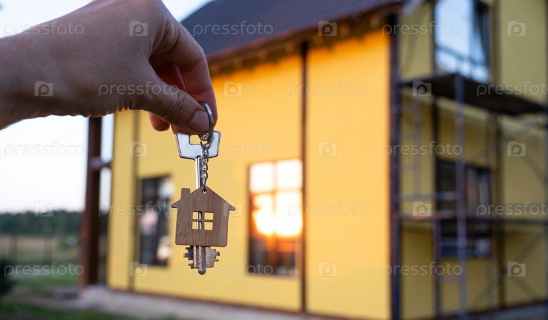 Рука с ключами от нового дома на фоне недостроенного коттеджа. Строительство, проект, переезд в новый дом, ипотека, аренда и покупка недвижимости. Открывать дверь. Копировать пространство
