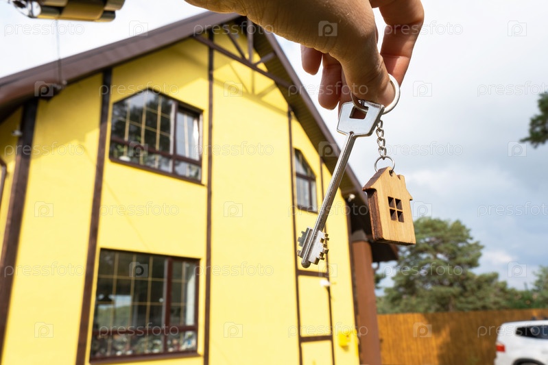 Рука с ключами от нового дома на фоне недостроенного коттеджа. Строительство, проект, переезд в новый дом, ипотека, аренда и покупка недвижимости. Открывать дверь. Копировать пространство