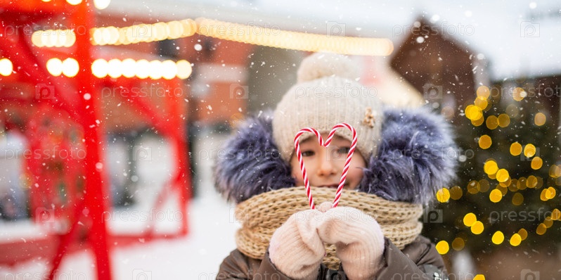 Красивая девушка держит в руках леденец в форме сердца на открытом воздухе в теплой одежде на зимнем праздничном рынке. Снежный городок к Новому году украсили гирлянды волшебных огней. Новогоднее настроение