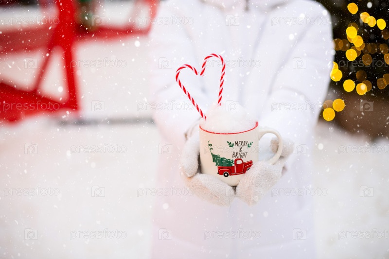 Женщина с кружкой снега, карамельной палочкой и надписью Merry and Bright в руках на улице в тёплых одеждах на зимнем праздничном рынке.Снежный городок к Новому году украсили гирляндами волшебных огней.Рождество