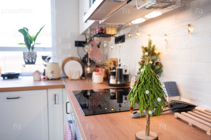 Рождественский декор кухни - подготовка к семейному празднику, гирлянда, елка, красный орнамент, забавные олени на шкафах, плита. Настроение праздника, кануна, Нового года