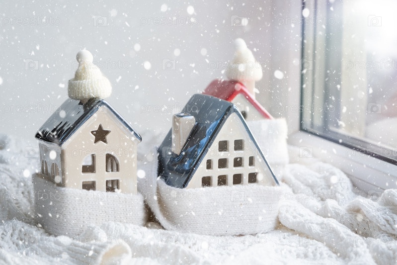 Уютный дом укутан шапкой и шарфом в декоре метель-подоконник. Зима, снег - утепление дома, защита от холода и непогоды, система обогрева помещений. Праздничное настроение, Рождество, Новый год