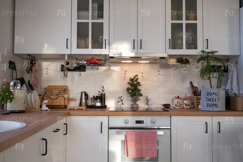 Рождественский декор кухни - подготовка к семейному празднику, гирлянда, елка, красный орнамент, забавные олени на шкафах, плита. Настроение праздника, кануна, Нового года