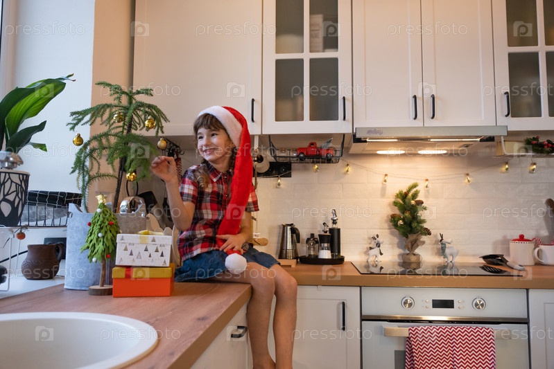 Ребенок в шапке Санты сидит на праздничной кухне, украшенной к Рождеству. Счастливая девушка наряжает комнатное растение араукарию в новогоднюю елку. Новый год