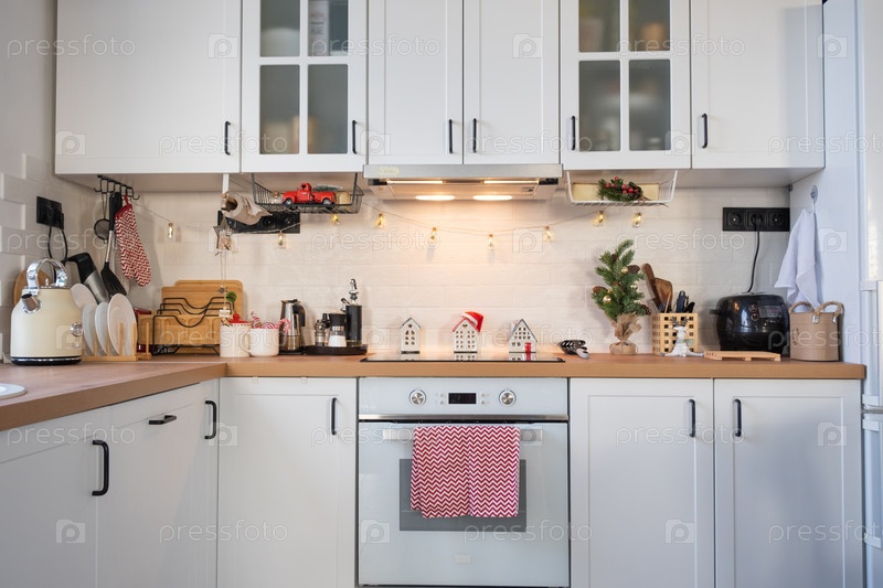 Рождественский декор кухни - подготовка к семейному празднику, гирлянда, елка, красный орнамент, забавные олени на шкафах, плита. Настроение праздника, кануна, Нового года