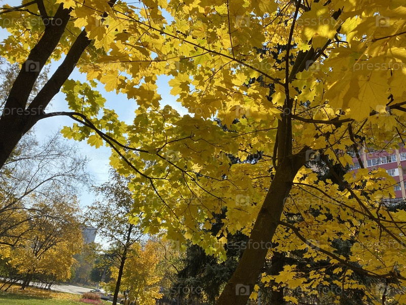 Желтые кленовые листья на дереве в сухой солнечный осенний день