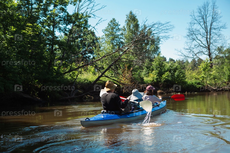 Пара мужчины и женщины в семейной поездке на байдарках, гребной лодке по реке, водному походу, летним приключениям. Экологичный и экстремальный туризм, активный и здоровый образ жизни