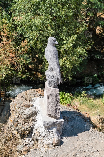 Армения, Нораванк, сентябрь 2022 г. Статуя горного орла на берегу реки