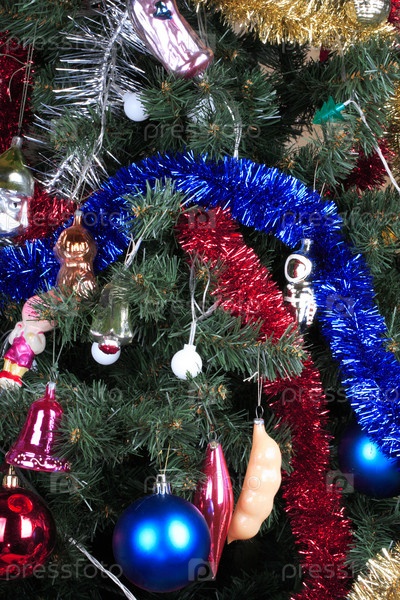 Игрушки на зеленой рождественской ели