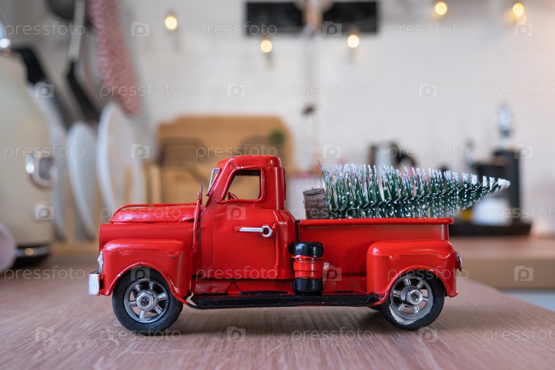 Красная ретро-машина с елкой украшает праздничную кухню к Рождеству. Домашний декор, праздничное настроение, Новый год