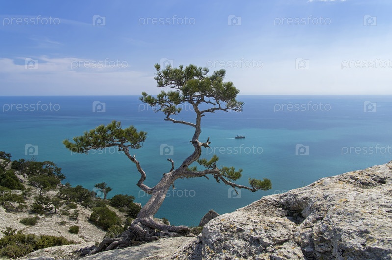 Реликтовая сосна на вершине прибрежной скалы на фоне моря. Караул-Оба, Новый Свет, Крым. Солнечный день