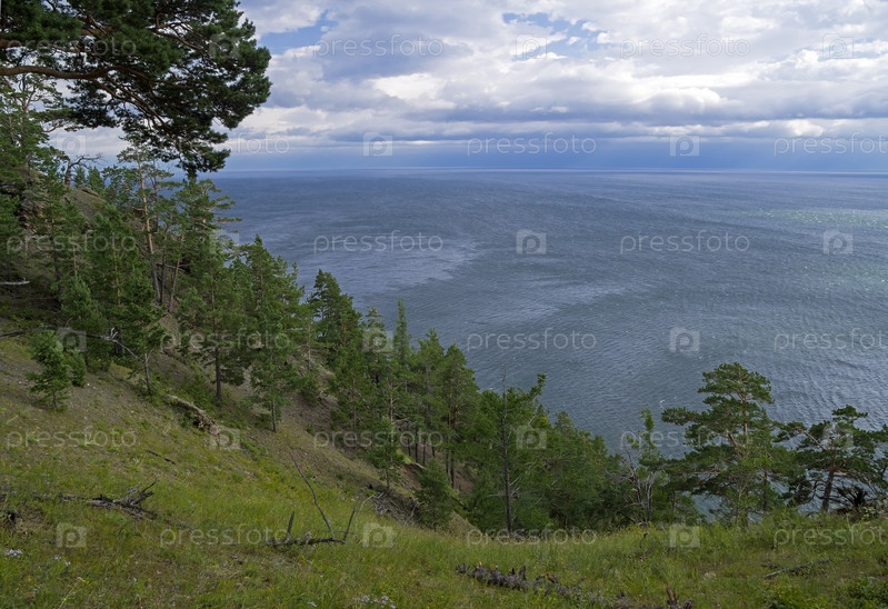 Вид на озеро Байкал со склона утеса Скрипер. Здесь проходит Большая Байкальская Тропа. Прибайкальский национальный парк, Иркутская область. Август