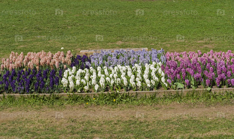 Красивые разноцветные гиацинты под ярким весенним солнцем