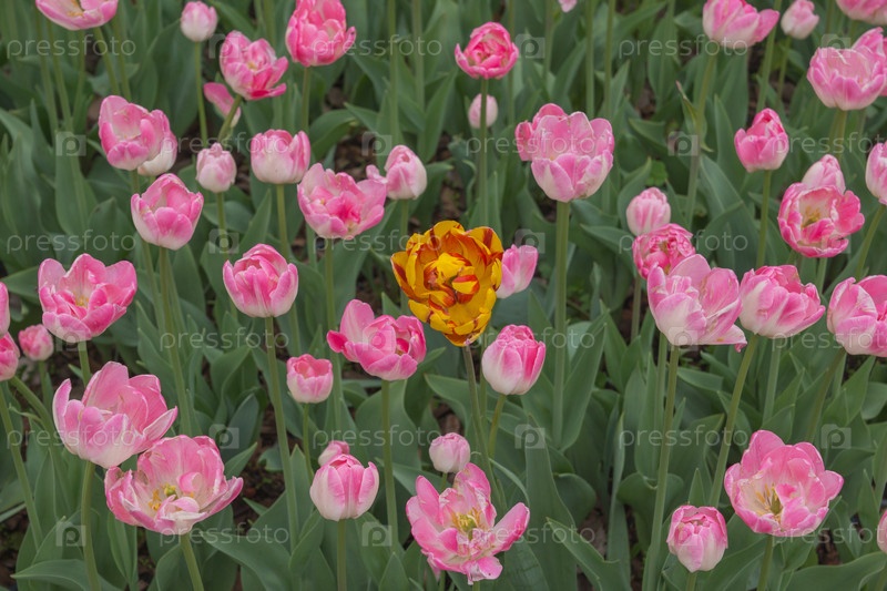 Красно-желтый тюльпан среди розовых