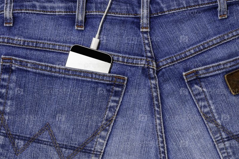 Провод смартфона и наушников в заднем кармане синих джинсов