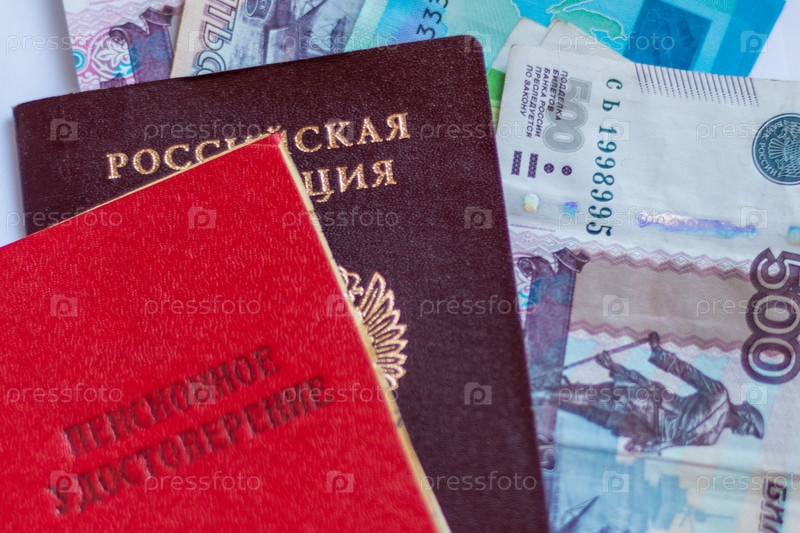 На столе российские банкноты, российский паспорт и пенсионное удостоверение. Надпись: 'Пенсионное удостоверение'
