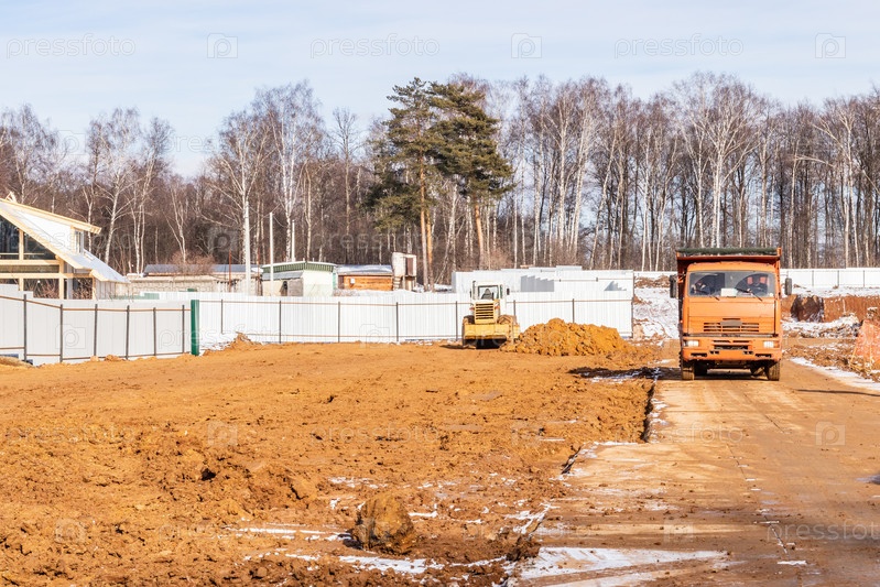 Строительство нулевого цикла нового жилого комплекса «в лесу». уровни строительной техники. Москва, Россия