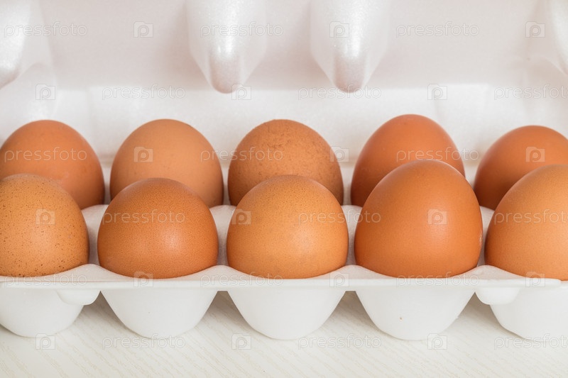 Куриные яйца в пластиковой упаковке на столе. крупным планом