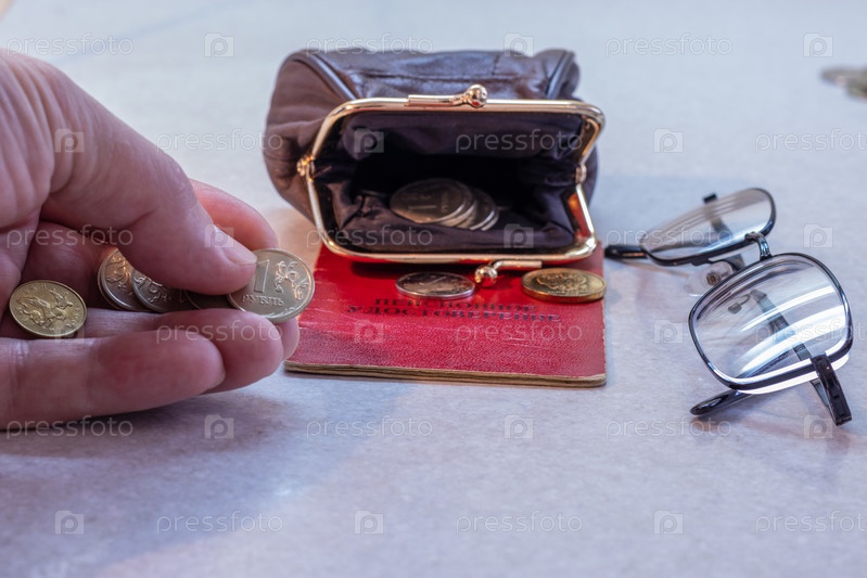 Пенсионное удостоверение, кошелек с деньгами и очки на столе. Надпись на удостоверении: «пенсионное удостоверение»