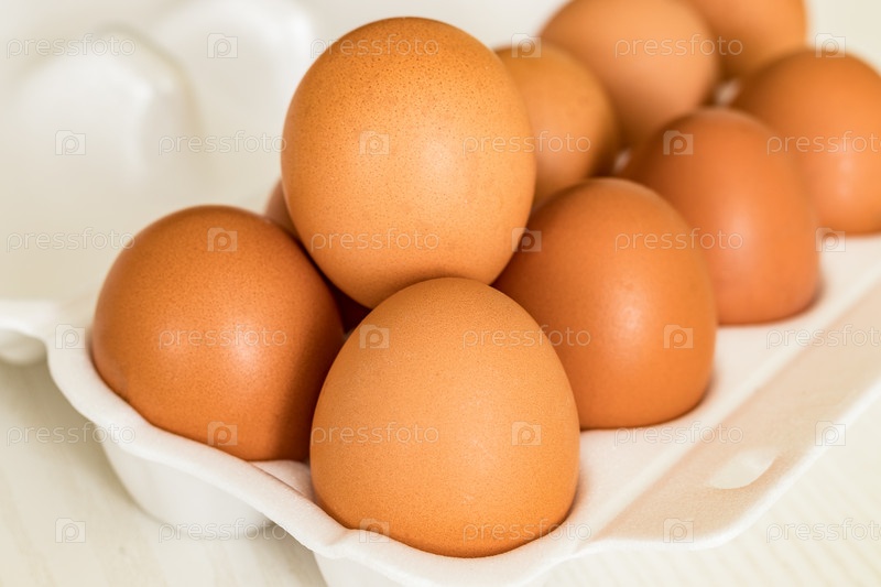 Куриные яйца в пластиковой упаковке на столе. крупным планом