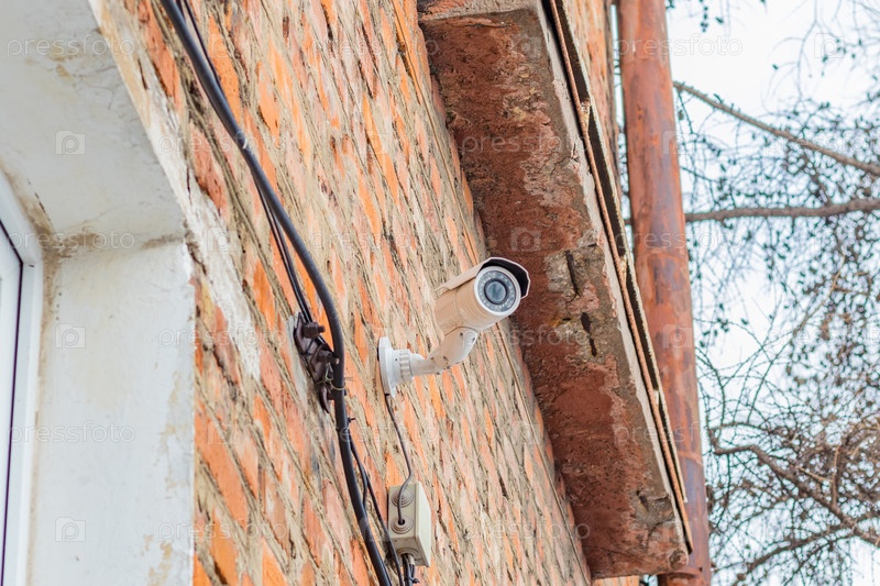 Камера наблюдения установлена на стене кирпичного дома. охрана, охрана, наблюдение