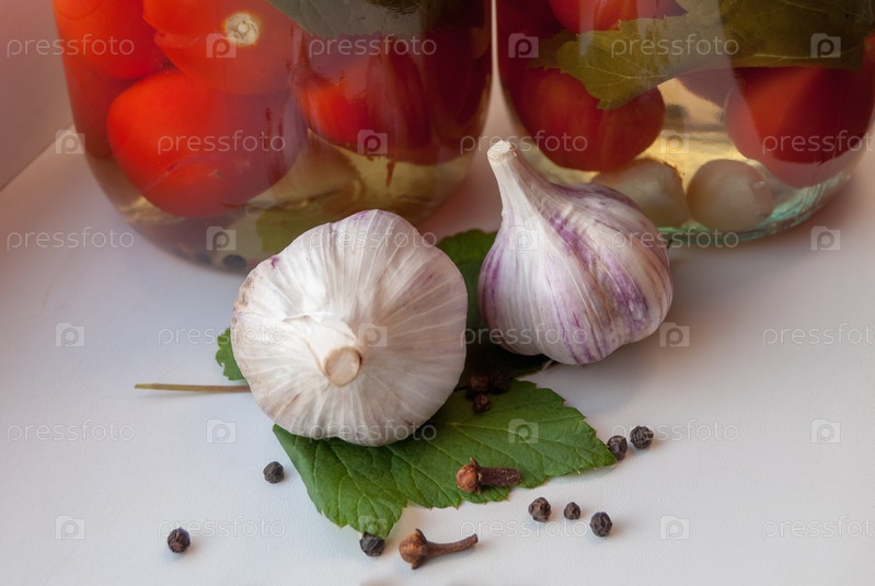 Консервированные помидоры в стеклянной банке, чеснок и приправы