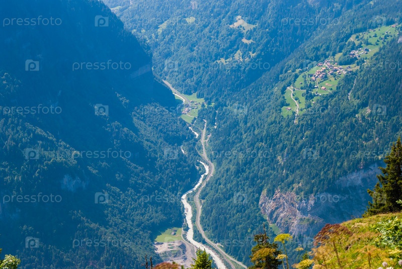 Вид сверху на глубокое красивое ущелье в швейцарских Альпах