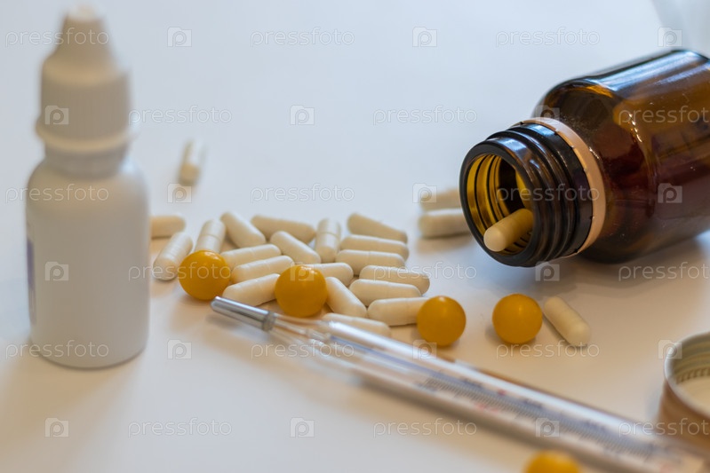 Термометр и таблетки от гриппа и простуды. крупным планом