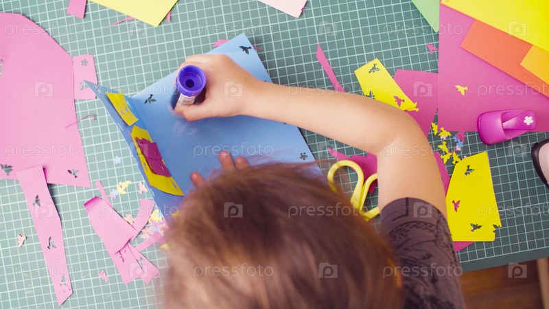 Руки маленькой девочки склеивают цветную бумагу