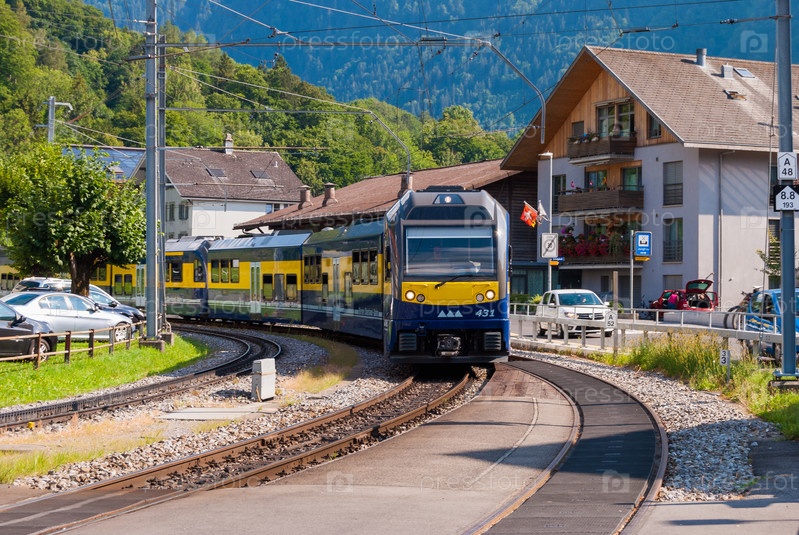 Поезд прибывает на станцию в швейцарском регионе Бернский Оберланд. Швейцария июль 2018 г