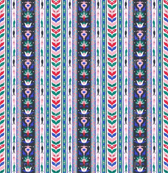 Геометрический дамасский орнамент. Икат границы. Этническая вышивка с листьями и монограммами. Племенная векторная текстура. Бесшовный народный узор в ацтекском стиле. Индийский, скандинавский, цыганский, мексиканский, африканский ковер