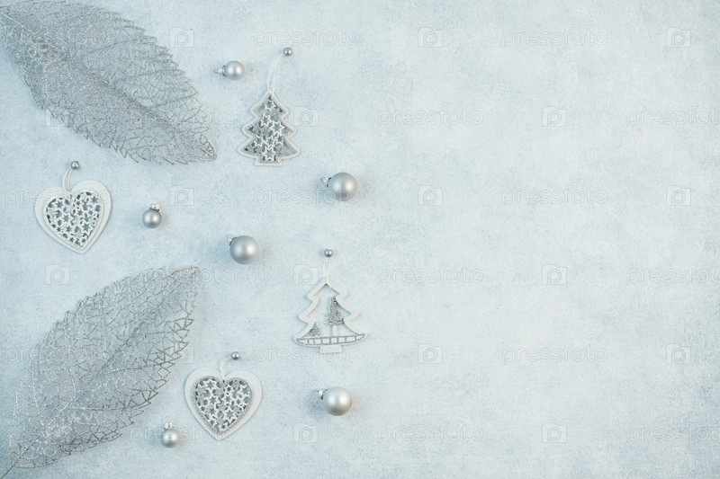 Концепция праздничного фона в серебристых тонах. Вид сверху на серебряные шарики из подарочной коробки на сером фоне. Макет фона новогодних праздников с местом для копирования