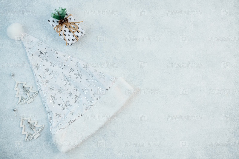 Концепция праздничного фона в серебристых тонах. Вид сверху на серебряные шарики из подарочной коробки на сером фоне. Макет фона новогодних праздников с местом для копирования