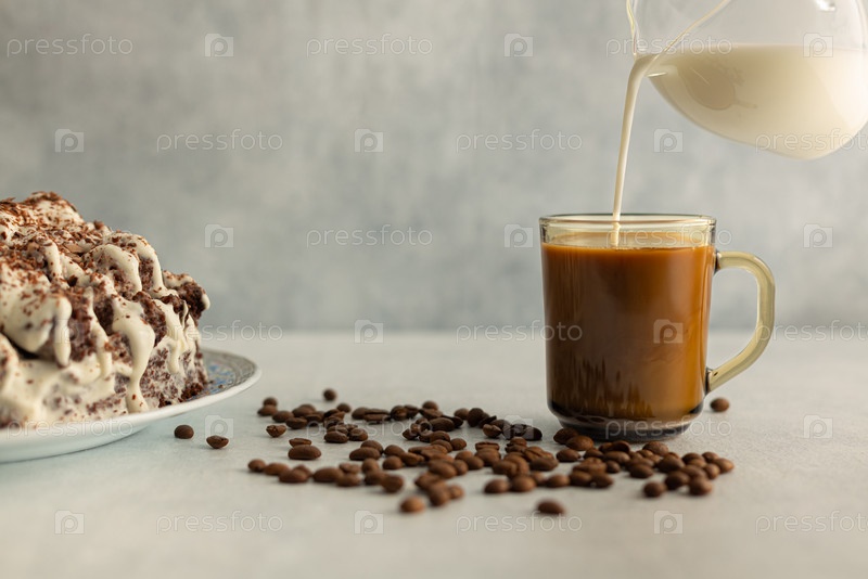 Кофе со сливками в стеклянной кружке с кофейными зернами, кремовый торт. сливки наливают из стеклянного кувшина. Напиток на светло-сером фоне