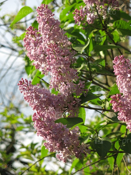 Пышная фиолетовая сирень цветет на кусте весной