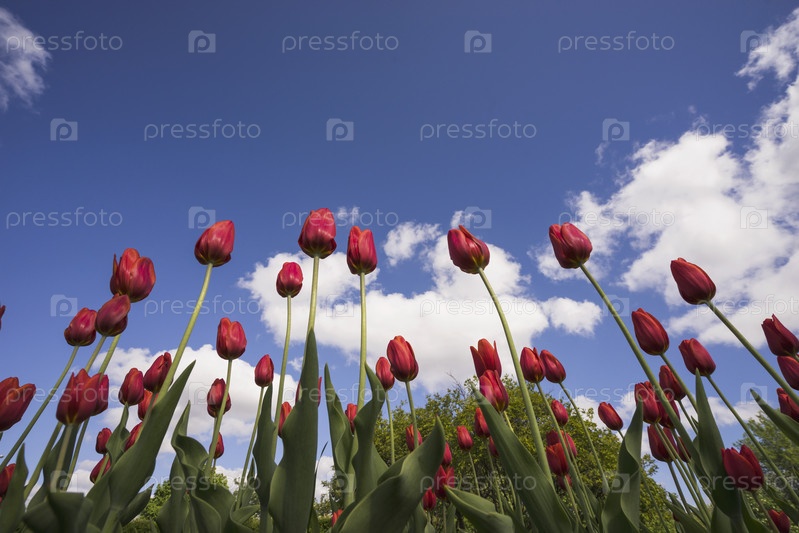Красные тюльпаны на фоне голубого неба